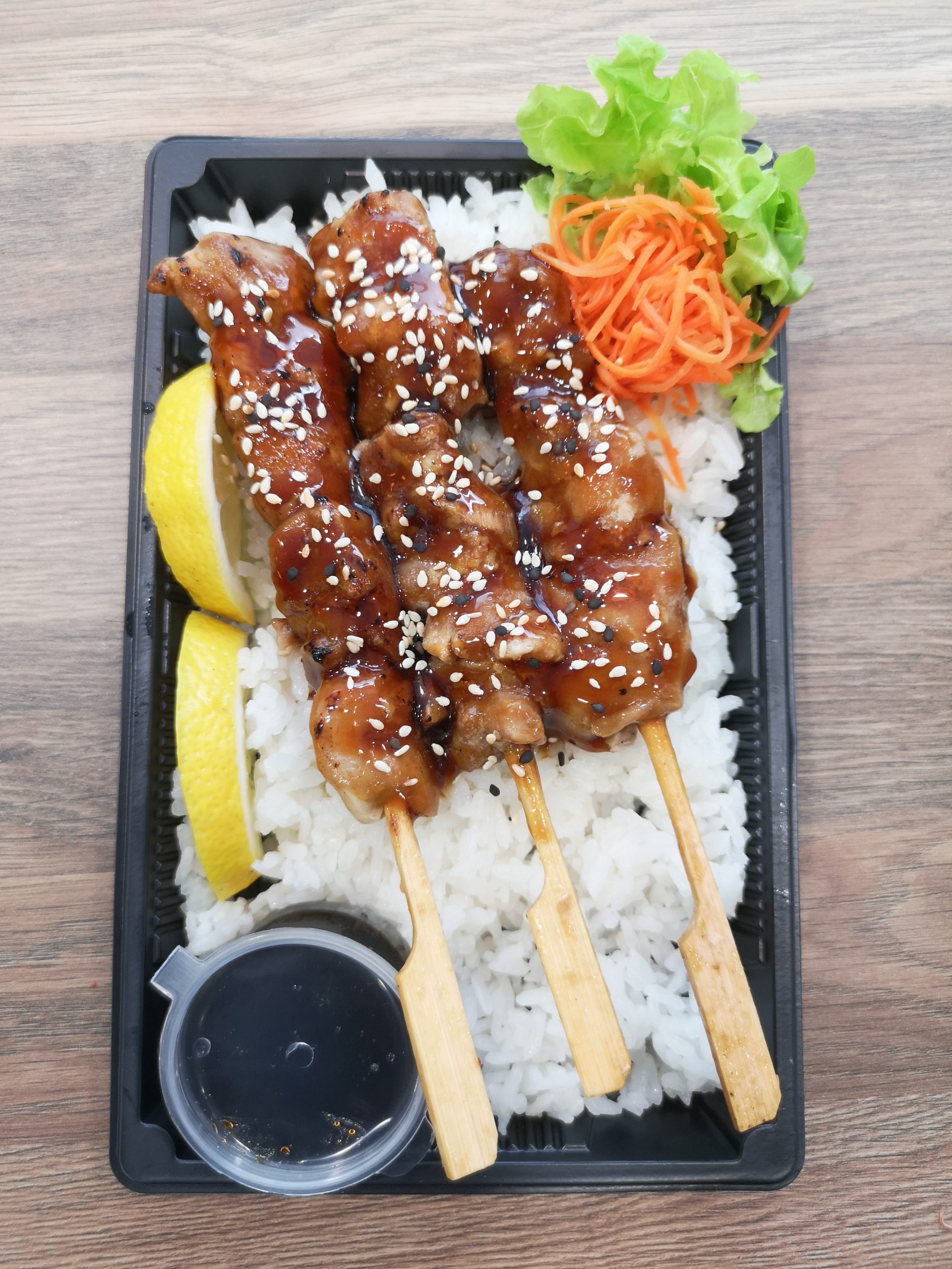 Drei Hühnchenspieße serviert mit Sushi Reis und Teriyaki Sauce