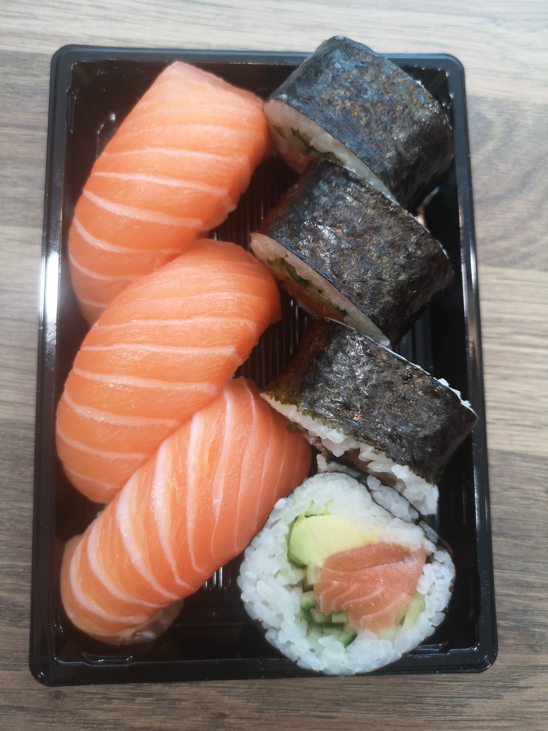 4 Futomaki mit Lachs, 3 Lachs Nigiri